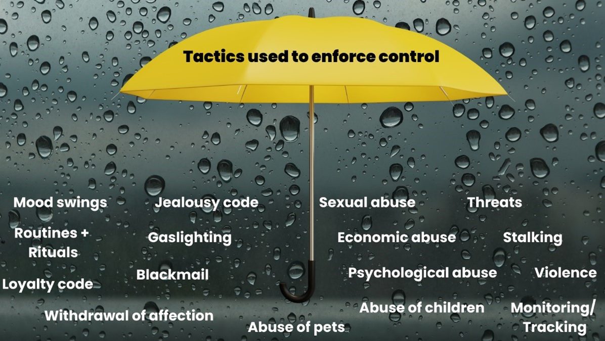 Control is best understood as the goal of Domestic Abuse and people who harm use a range of tactics to enforce control and limit the survivor’s ‘space for action’ (Liz Kelly), limiting the survivor and their children’s ability to freely think, be and do.